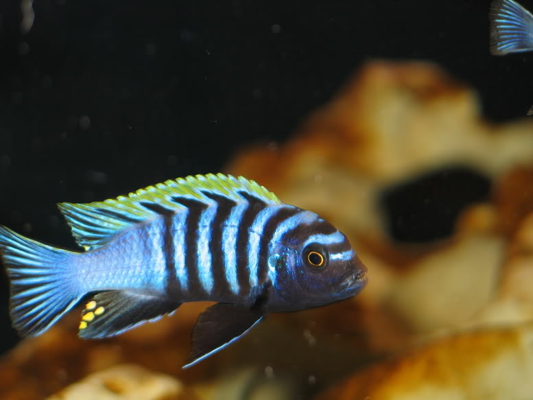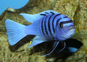 Habitad y distribución: Se encuentra distribuida a lo largo de todas la costa norte del lago Malawi, cerca de Likoma y la isla de Chizumuluy a lo largo de la costa noreste de Ntekete. En su ambiente natural las hembras y machos dominados habitan generalmente las partes altas poco profundas y de poco sedimento para buscar alimento, por el contrario los machos dominantes tienden a buscar alimento en las aguas mas profundas y de mayor sedimentación. Son de las especies de Mbunas que más se adentran en aguas profundas en busca de alimento y para su reproducción. Existen unas 15 variedades de este pez que varian en su tono de coloración, en todas las especies predominan los tonos blancos y azul así como las rayas verticales negras, los machos dominantes poseen un color amarillo intenso en su aleta dorsal y lost onos azules son más intensos, en cambio las hembras pueden tener una coloración poco azulada y las franjas verticales son muy tenues, esta carácteristica tambien lapueden presentar ejemplares machos de menor jerarquía. Gustan de esconderse entre piedras y troncos, el sedimento de preferencia debe de ser fino de tal manera que les facilite escarbar y formar sus nidos y marcar su territorio.