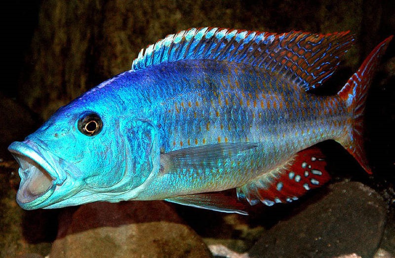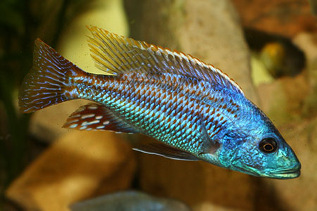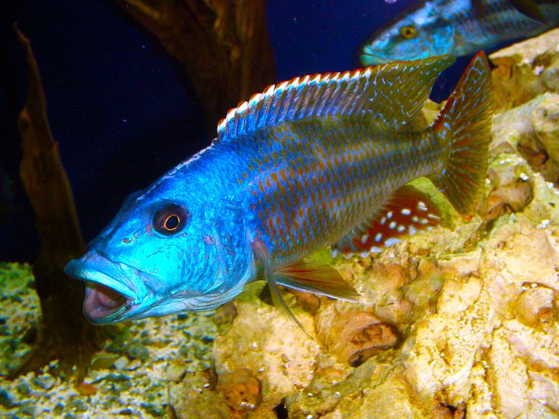 Alimentación:Es un depredador especialmente piscívoro. En la naturaleza se alimenta principalmente de peces pequeños. En el acuario aceptará comida seca como: “sticks” o “pellets” especiales para cíclidos, camarón seco, krill y lo podemos complementar con alimento a base de espirulina para ayudar a la coloración azul. Además alimento vivo como artemia, gusanos de harina, camarón crudo, mejillón y gamba entre otros. En su edad adulta, no se recomienda darles escamas comerciales, ya que, al ser un pez de gran tamaño, probablemente este tipo de alimento ensuciará más el agua en comparación con el beneficio que obtendrá en intentar comérselas.