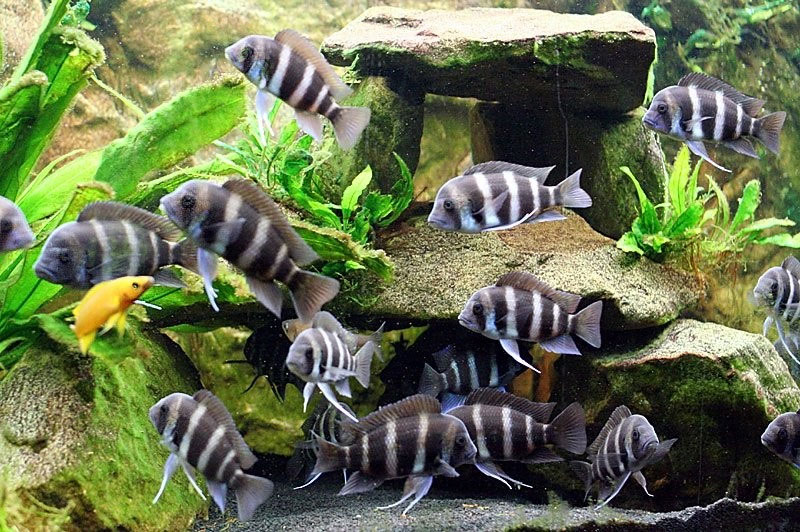 Carácteristicas principales: 6 bandas negras vérticales atraviesan su cuerpo, una de ellas característica de esta variedad de frontosa es que una banda atraviesa la cabeza y ojos.