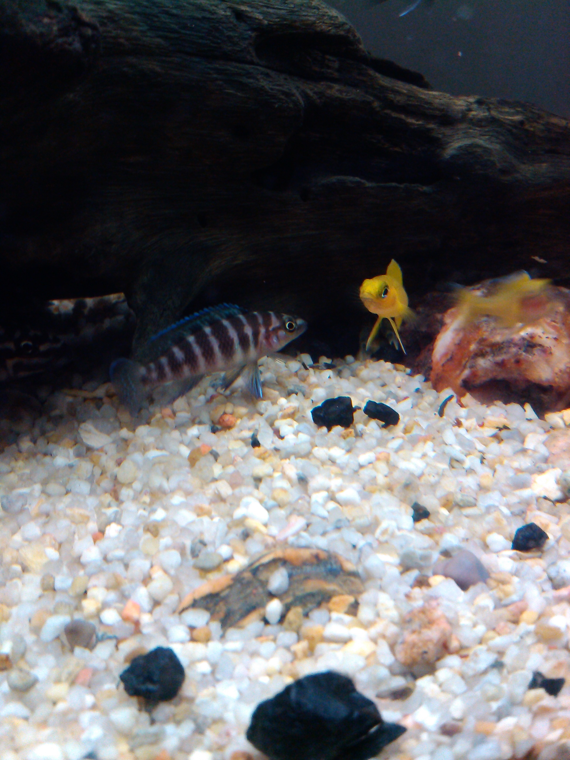 Comportamiento y reproducción: Son peces de comportamiento solitario una vez que abandonan el nido de sus padres, suelen ser sociables buscando pareja en las épocas de reproducción, su temperamento es bastante tranquilo con peces de talla similar de otras especies, sin embargo con los de su misma especie se comporta de manera agresiva y territorial sin llegar a tener ataques mortales, muy rara vez ocasionan la muerte de sus congeneres, en las épocas de cría su temperamente se vuelve más agresivo como la mayoría de los ciclidos. Es un buen compañero de acuario para otras especies del Taganika, no se intimida con especies como frontosas que pueden superarle por mucho en tamaño y que serian un buen alimento para tales peces, suelen pasar inadvertidos con frontosas de gran tamaño que podrian devorarlos fácilmente, merodean los rincones de los fondos rocosos merodeando en la arena fina buscando alimento, suelen buscar rincones de poca luz, su reproducción naturala y en cautiverio tiende a ser un proceso largo , no presentan dimorfismo sexual, por t para saber el sexo es recomendable mucha paciencia hasta ver formadas las parejas, se recomienda un grupo de 10 a 15 ejemplares juveniles para que se desarrollen y formen las parejas en un período de al menos 8 meses a un año, cuando se forman las parejas estas suelen ser más agresivas con miembros de su misma especie, en este momento se recomienda separarlos, el cortejo dura hasta un mes antes de la puesta de los huevecillos, generalmente la hembra busca refugio dentro de una pequeña cueva entre rocas para depositar sus huevos mientras que el macho esta alerta en el exterior defendiendo alrededor de su territorio cualquier intruso, la hembra deposita entre 50 a 300 huevos, son muy buenos padres, cuidan de su prole por bastante tiempo hasta alcanzart un tamaño considerable de 3 a 4cm antes de que ocurra la siguiente puesta, hay que tener en cuenta que estos peces crecen muy lentamente, por ello los alevines permanecen con sus padres bastantes meses hasta que son expulsados del nido por sus progenitores, cuando sucede esta acción quiere decir que los padres probablemente hayan tenido o esten a punto de hacer un nuevo nido. Se considera su reproducciónfácil pero de mucha paciencia. En ocasiones los padres pueden hacer un nuevo nido con una nueva prole de crias y los hermanos de la camada anterior tambien se encargan del cuidado de sus nuevos hermanos, esta ha sido una estrategia de supervivencia que a tráves de la evolución les ha permitido ser una especie prolifica en su entorno natural.