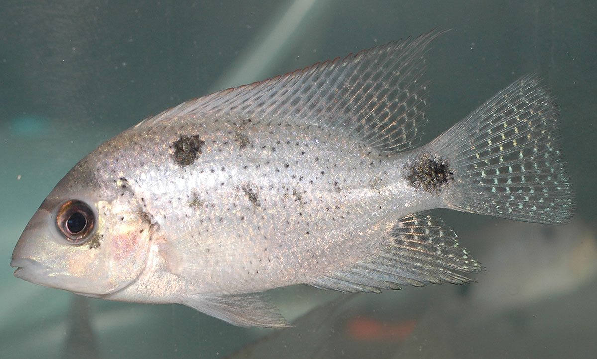 Alimentación, condiciones del agua y comportamiento: Es bastante tolerante con los nitratos, pudiendo soportar perfectamente hasta 500 ppm de este componente (aunque se recomienda no sobrepasar las 50) pero no tolera los nitritos ni el amoniaco, que deben mantenerse siempre a 0 ppm. Uno de los problemas que ofrece este pez es que, si no se encuentra en las condiciones ideales, su líbrea pierde brillo y color, por lo que aunque el pez sobrevive con más o menos normalidad, a la larga puede acarrearle problemas sanitarios bastante graves tales como Hexamitasis, Exoftalmia, podridura de aleta y Punto blanco. No es exigente con la comida. Se come cualquier cosa comestible que caiga al agua sin pensárselo, aunque conviene ofrecerle un buen aporte proteico mezclado con algunas tomas de alimento vegetal (al menos dos o tres veces por semana). Como alimento base se puede usar la comida específica para Cíclidos (en palitos o gránulos) y se puede alternar con alimento congelado (papilla para Discos, Tubifex, Artemia, …) y con alimentos vegetales (copos o pastillas de Spirulina). Una de las ventajas de este Cíclido es que es de los más pacíficos y tranquilos que existen entre los de su mismo tamaño, siendo habitual observarlo en acuarios comunitarios de gran tamaño junto a una gran variedad de especies. No obstante, como todo Cíclido, se puede mostrar algo belicoso con peces recién llegados (más si no tienen su mismo tamaño) y, en el caso de que lo provoquen, se defenderá encarnizadamente. Tampoco convienen los peces demasiado pequeños que puedan entrar por su boca ya que termina devorándolos ni peces demasiado tímidos o asustadizos que pueden sentirse permanentemente intimidados ante este pez de gran tamaño. Siempre que el acuario en el que viva sea de gran tamaño (más de 400 litros) puede convivir con otros peces de su mismo tamaño y de caracter pacífico: Óscares, Cíclidos Loro, Convictos, bocas de fuego y Terrores verdes son buenos candidatos para vivir con la Mojarra plateada. Tambien convive muy bien con peces de fondo de tamaño medio y grande (Plecostomus, Ancistrus, …) y no causa daño alguno a invertebrados. Al igual que cualquier Cíclido, si vive en pareja su agresividad se acentúa, cosa que tambien ocurre si vive en acuarios demasiado pequeños.