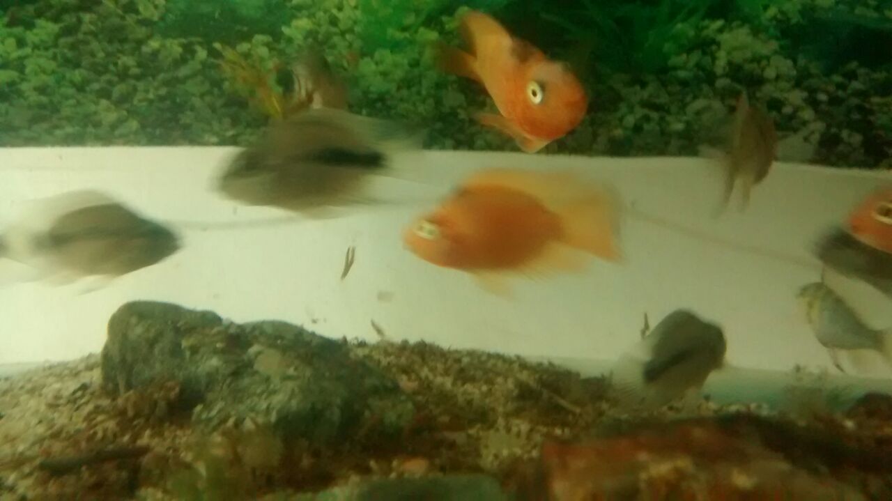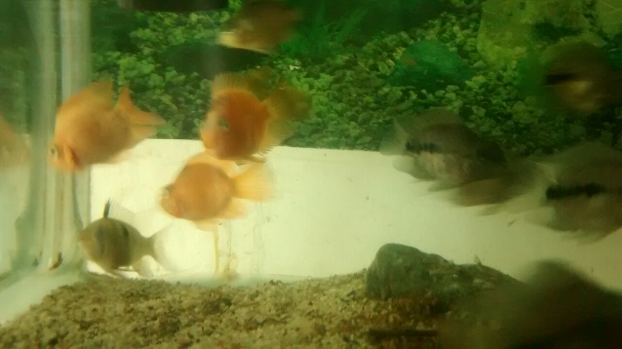 Lindos ejemplares de ciclidos perikos naranja de sangre juvenil, creciendo y tomando color .